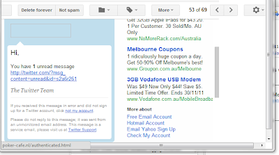 It actually looks exactly like the e-mail notifications I receive daily from Twitter — that is, except for the link content. Apparently they were not clever enough to mask the content of the underlying link with a random URL shortener. 🙂 This e-mail was actually caught by Gmail’s spam filter. I must say that I am impressed by the speed and intelligence of their spam detection system. It is very rare that it actually catches ham.