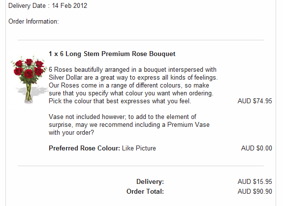 I usually don’t blog about my personal shopping experience, but a recent experience forced me to publish this post. I travel a lot for business, so for Valentine’s Day I decided to order a bouquet of flowers for my wife. Well knowing that online flower delivery is a trivial online commodity these days, I opened up Google and searched for “flower delivery”. One of the first hits was an allegedly Australian company, ReadyFlowers.com.au, which promoted their special same-day Valentine’s Day delivery of high quality roses. Order before 1pm and the flowers will be delivered the same day all over Australia, the company advertises proudly. Valentine’s Day is on February 14 and I put in my order for “6 long stem premium roses” (product link) on February 13 before lunch. According to ReadyFlowers, everything was all good and on track for delivery: