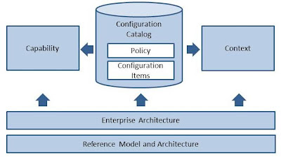 The central part of the framework is to establish the mechanism by which standardization and differentiation are managed. A Configuration catalog is effectively a logical version of the CMDB. It records the Configuration Items available for a Capability (and it’s a long list including business process, workflow, services, implementation components, portlets, templates, policies and so on). Each Configuration Item is attributed with flexibility options and crucially constraints (policies). The Configuration Catalog is effectively a Software Factory Schema, except that its scope is much broader than software development, covering the entire range of artifacts including COTS products, internal and external services as well as custom applications. The Configuration Catalog is the core driver of architecture integrity, providing active governance over the configuration and reconfiguration of components. If a business unit believes it must diverge from the standard configuration, the question will be, is this purely localized behaviour, or is the localized requirement actually part of a broader demand signal? Can the localized behaviour be accommodated within the enterprise reference model, in which case further configuration is not compromised, or is this a genuine one-off?