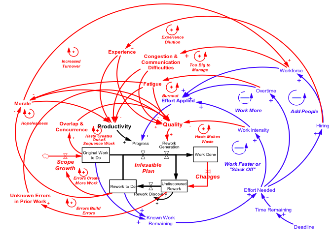 However, research into this area showed that option #1-3 generate negative “side effects” that can develop into vicious cycles having major impacts on the project. For example, by adding more staff, the average experience of the team is diluted, lowering the productivity of the team and also causing more errors in work done.