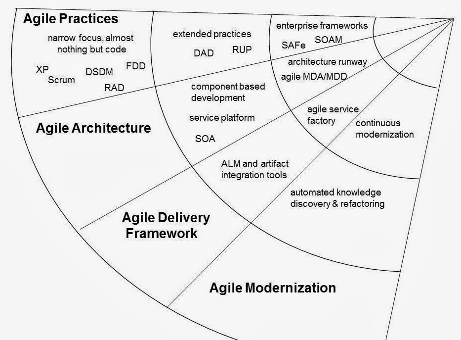 People & Process. Much of the dissatisfaction with Agile arises from the limitations of the basic Agile practices, and the need to compromise these in an enterprise context. Both DAD and RUP (yes it’s an iterative method) are examples of extended or hybrid practices that introduce coordination, phasing and other disciplines that are more acceptable in enterprises that require traceability, governance and compliance with pre-existing life cycle practices. Enterprise frameworks such as Leffingwell’s SAFe as discussed and Everware-CBDI’s SOAM are examples of frameworks that adhere more closely to the purity of Agile principles while addressing enterprise specific needs. SAFe provides a framework which is more strongly Lean, coordinating portfolio, program and project activity to meet agile release train demand. SOAM provides a complementary, full life cycle process framework for software service modernization and delivery.