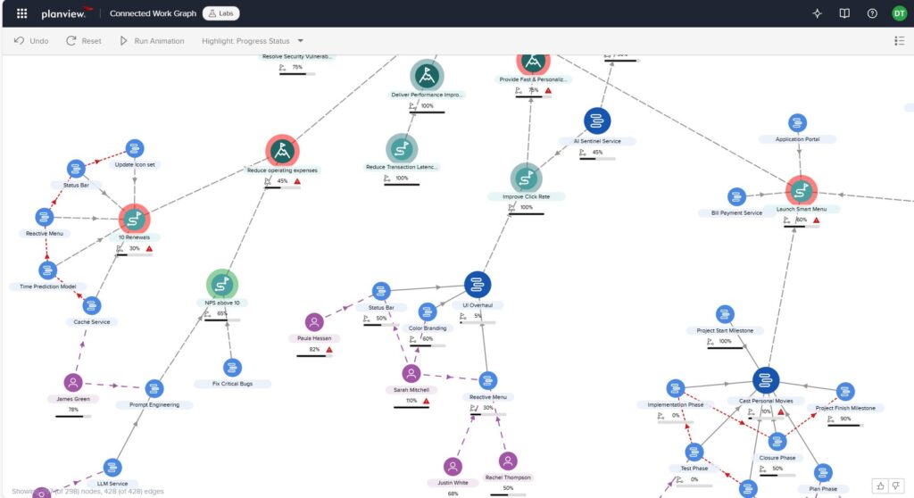 Planview’s Connected Work Graph provides a visual representation of your network of work, resources, and outcomes so you can identify and address dependencies and risks.