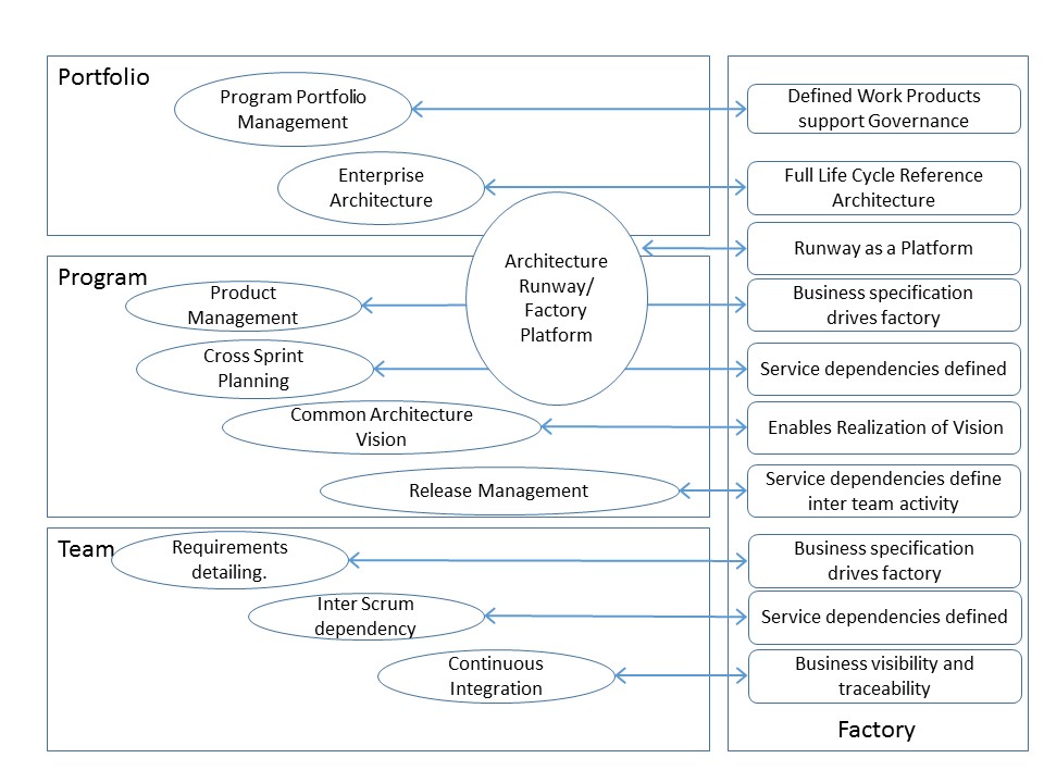 By utilizing work products that are part of a defined process based on the full life cycle reference architecture, the factory approach reduces the essential complexity of the scaling task. All moving parts are under management. This doesn’t detract from the inherent purity of the Agile approach. Rather, the defined process provides clarity over the minimum necessary “planning work” (intentional architecture, rules definition and business requirements). And the reference architecture and factory process provide a firm foundation on which emergent architecture can be more effectively carried out by the cross functional delivery team. This is likely to encourage programs to adopt a hybrid approach to their organizing model, embracing elements of LeSS like guidance to optimize multiple concurrent Scrum based sprints with continuous delivery, and to complement them with minimum necessary elements of SAFe, particularly those that are required to communicate to more conventional stakeholders. But, at least for mid-sized projects, maybe up to 10 teams, it seems overkill to adopt the formality of PI Planning and everything that comes with it.