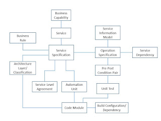 In my post Service Factory 2.0 [6] I describe the conceptual background of the Software Factory, ideas pioneered by my old friend Keith Short and Jack Greenfield while they were at Microsoft. Today these have evolved and become specialized around a framework of tools, repeatable processes and patterns for creation and assembly of services – manifest as first order components with formal interfaces. If you consider that all core business functionality is increasingly composed of services and their operations, this provides us with a reference architecture that by design implements separation of concerns. Figure 1 below is a conceptual view of the scope of the service factory in terms of managed objects.